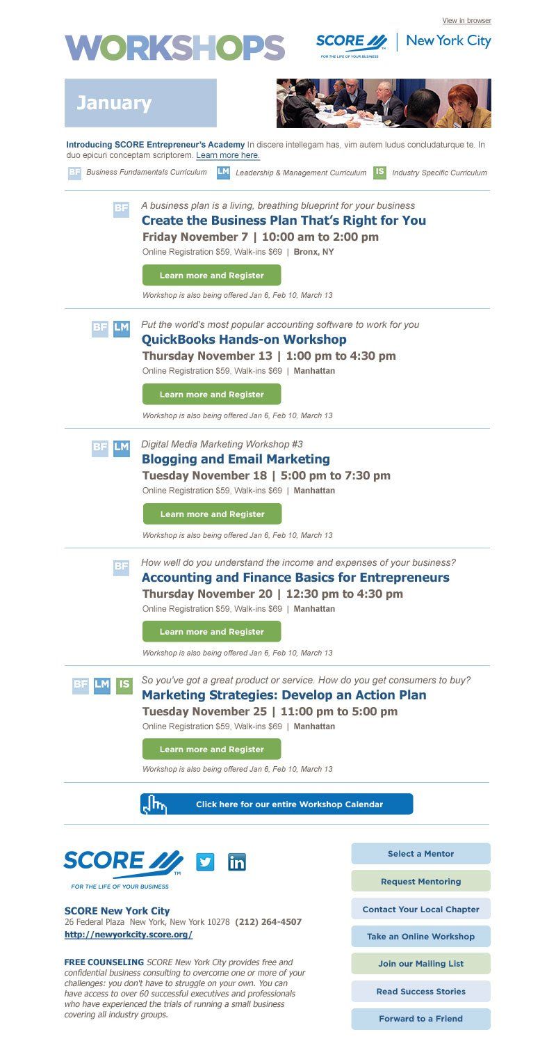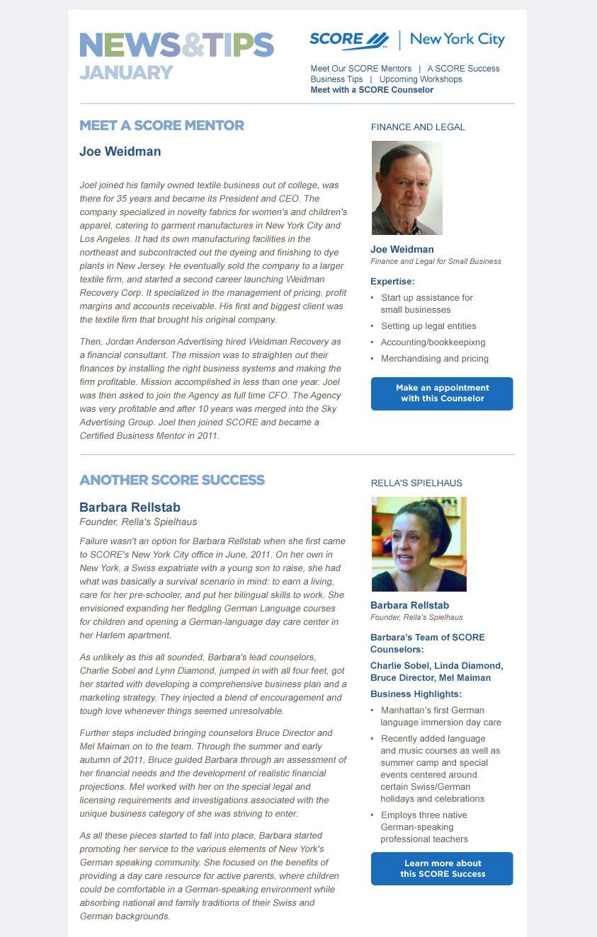 Blog, newsletter, e-blast design for SCORE, largest network of business volunteers-mentors.